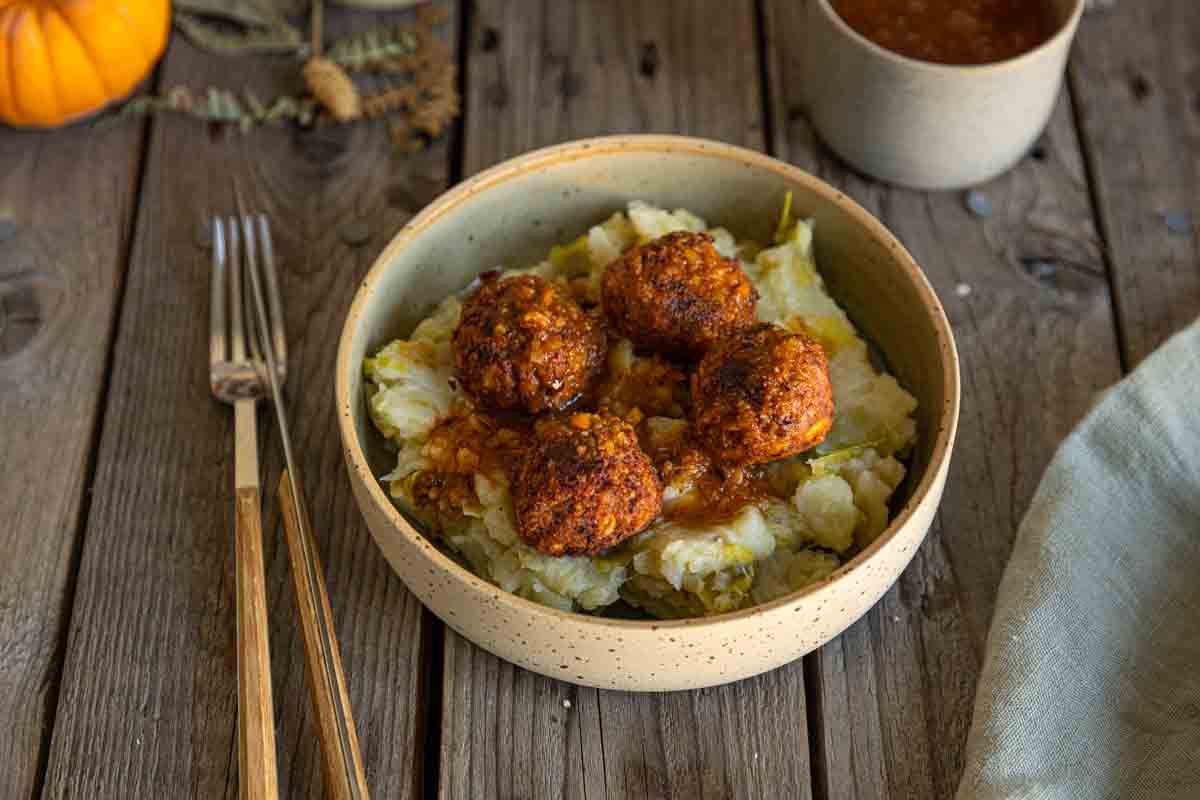 - Servez les boulettes sur le stoemp, nappées de sauce.