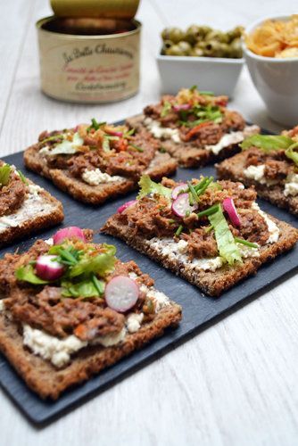 2) Ajoutez ensuite l’émiettés de canard, suivi de la salade croquante et des radis finement tranchés. Pour parfaire le tout, saupoudrez d’un peu de ciboulette ciselée, ajoutant fraîcheur et couleur à vos tartines.