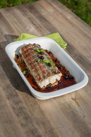 - Étalez le mélange sur un filet de merlu, recouvrez avec le second filet à l’envers et poivrez. Positionnez le bacon sur le dessus et ficelez le tout pour former un rôti.