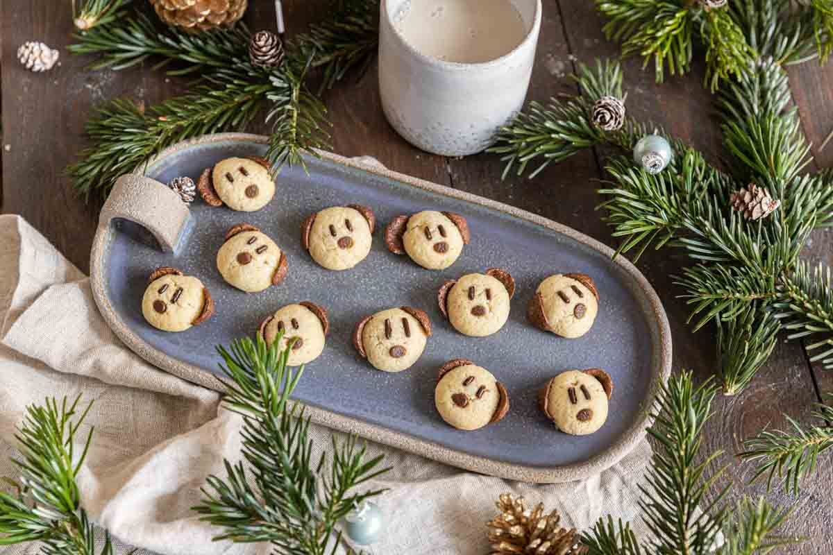 - Formez des petites boules de pâte d'environ 10 g. Décorez avec 2 pétales de céréales pour les oreilles, une pépite de chocolat pour le nez et 2 vermicelles pour les yeux. Disposez sur une plaque recouverte de papier sulfurisé et enfournez pour 12 minutes. Laissez refroidir sur une grille et conservez dans une boîte en métal.