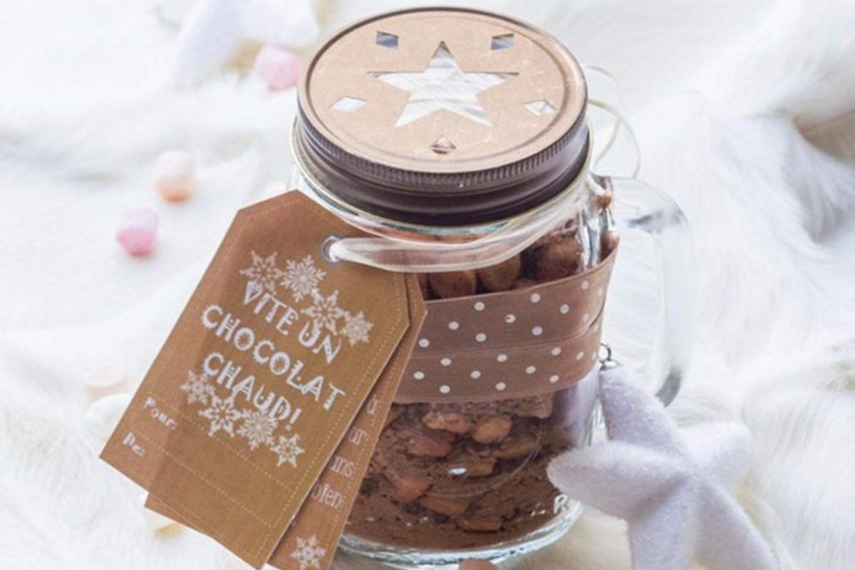 - Tamisez ensemble le lait, le sucre et le cacao. Ajoutez ensuite les marshmallows et mélangez bien. Remplissez votre bocal et n’oubliez pas d’inclure une étiquette avec les instructions : "Pour un chocolat chaud parfait, mélangez 4 cuillères à soupe du mélange avec un mug de lait bien chaud !"
