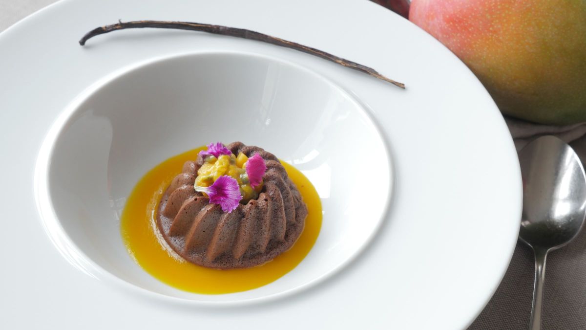 Créé par Sébastien Roux, chef renommé du Golf Hôtel à Brides-les-Bains, en collaboration avec Nathalie Négro, diététicienne au Centre Nutritionnel des Thermes de la même ville, ce moelleux au chocolat avec son coulis passion est un dessert à la fois exquis et léger. Chaque portion ne compte que 180 calories, ce qui en fait un choix judicieux pour les amateurs de douceurs.