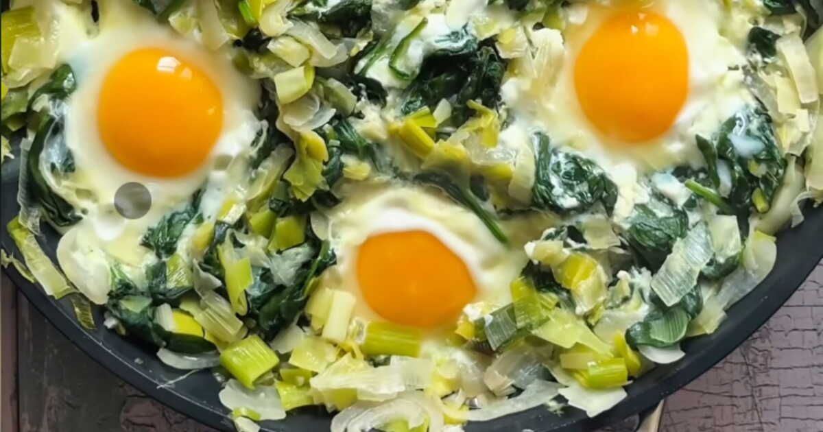 Pour préparer cette chakchouka, commencez par faire chauffer un filet d’huile d’olive dans une poêle. Ajoutez deux gousses d’ail pressées et deux oignons finement émincés. Une fois translucides, incorporez trois poireaux coupés en rondelles et une pincée de sel. Versez 150 ml de bouillon de légumes et laissez mijoter à feu doux pendant 15 minutes, jusqu'à ce que les poireaux soient tendres. Ajoutez 200 g de pousses d'épinards et incorporez-les quelques instants avant d'ajouter une cuillère à soupe de crème fraîche. Créez des petits creux dans la préparation et cassez-y six œufs. Couvrez et laissez cuire pendant 5 à 6 minutes pour obtenir des blancs bien cuits tout en gardant les jaunes coulants. Terminez par une touche de poivre, des morceaux de feta émiettée et une poignée de persil plat ciselé. Servez chaud avec du pain grillé qui collectera avec délectation les œufs fondants et la sauce parfumée.