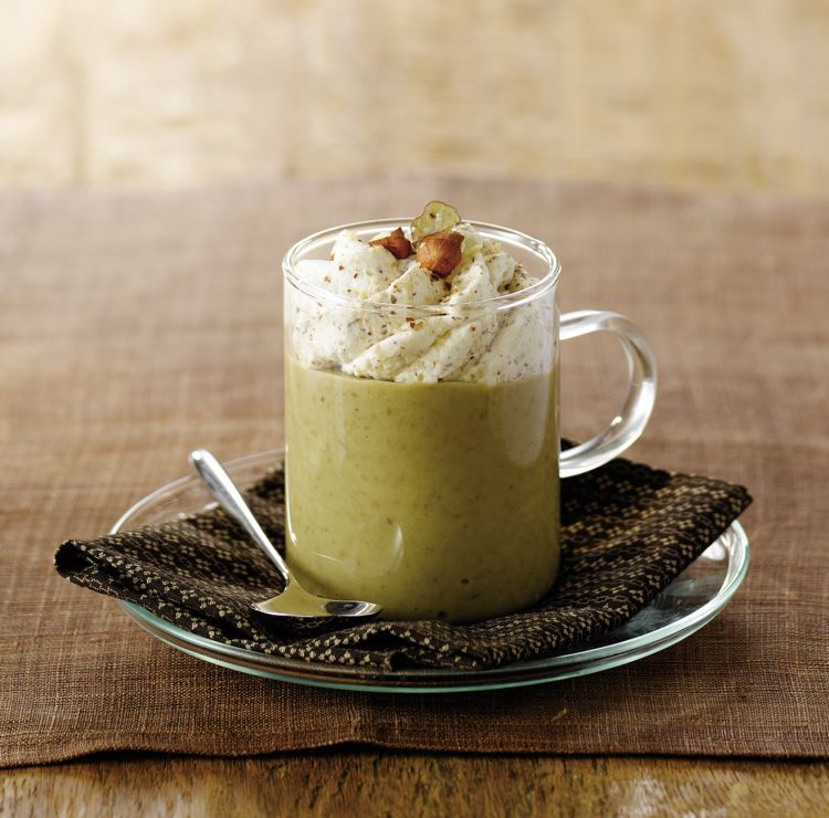 3) Pour dresser, versez la crème de lentilles chaude jusqu'aux 4/5 des tasses que vous allez utiliser. Complétez avec la chantilly à la noisette et décorez chaque portion d'une noisette entière. Servez et dégustez immédiatement pour profiter de toute la fraîcheur des saveurs!