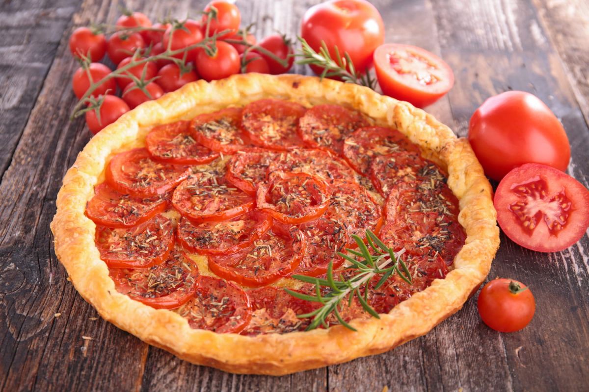 Pour cette délicieuse tarte, le chef opte pour des tomates cerises, généralement plus sucrées, mais vous pouvez utiliser vos tomates préférées tant qu'elles sont bien mûres. Voici la liste des ingrédients pour servir environ 5 à 6 personnes :