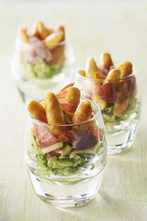 3) Prenez 6 grandes verrines et disposez au fond 1 à 2 cuillères de courgettes marinées. Ajoutez quelques mini quenelles sur le dessus et décorez avec des copeaux de jambon cru pour une touche finale élégante.
