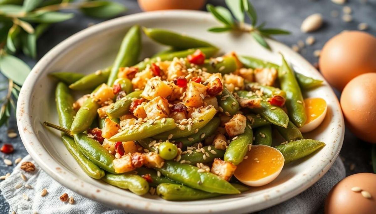 Pour commencer, réhydratez les pois gourmands en les immergeant dans de l'eau chaude pendant environ 10 minutes. Pendant ce temps, combinez dans un petit bol l'ail en poudre, la sauce soja, le miel et le piment d'Espelette. Dans un wok préchauffé à feu moyen, ajoutez l'huile d'olive. Une fois les pois gourmands égouttés, incorporez-les au wok et faites-les sauter pendant 5 à 7 minutes. Ensuite, versez le mélange de sauce sur les pois, en continuant à sauter jusqu'à ce qu'ils soient bien enrobés. Enfin, ajoutez les graines de sésame en toute fin de cuisson pour apporter un croustillant bienvenu.