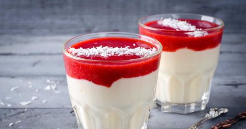 - Portez les fraises restantes à mixer avec un peu de crème fleurette pour en faire un coulis, puis déposez-en sur les panna cottas avant de servir.