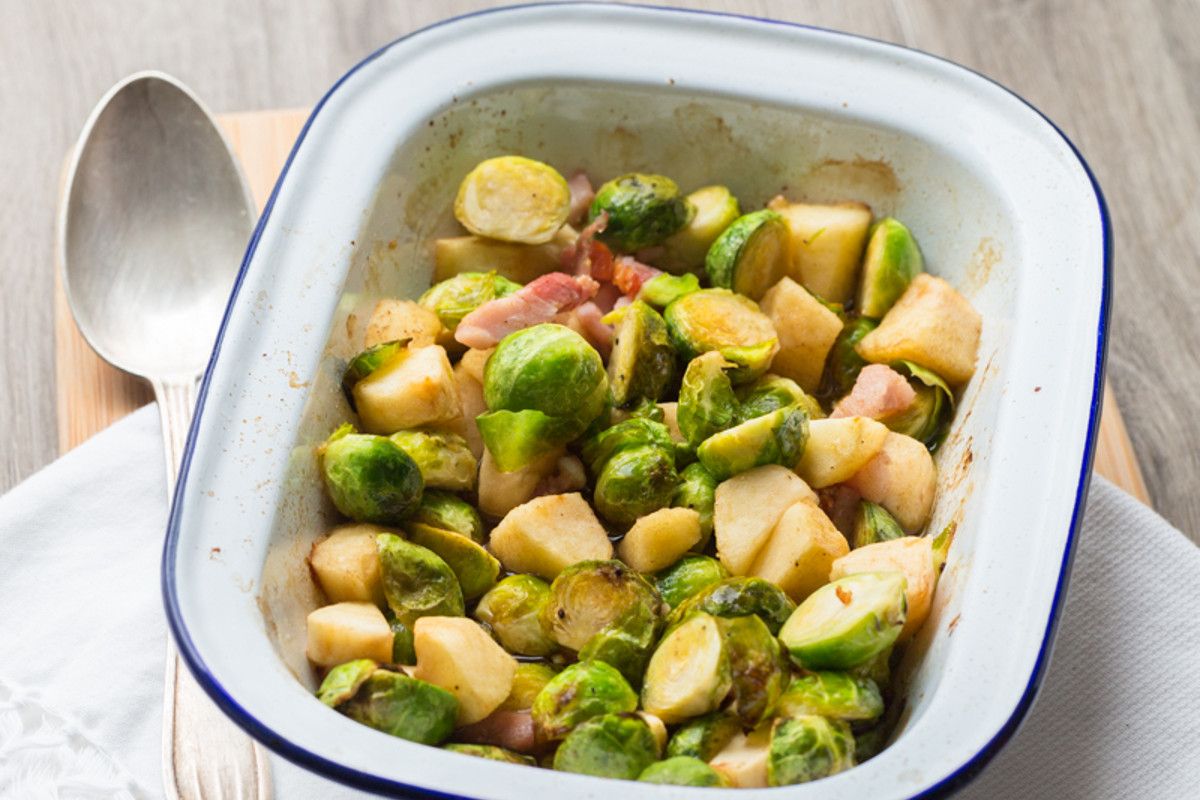 - Dans un plat allant au four, mélangez les choux, les pommes et les lardons.